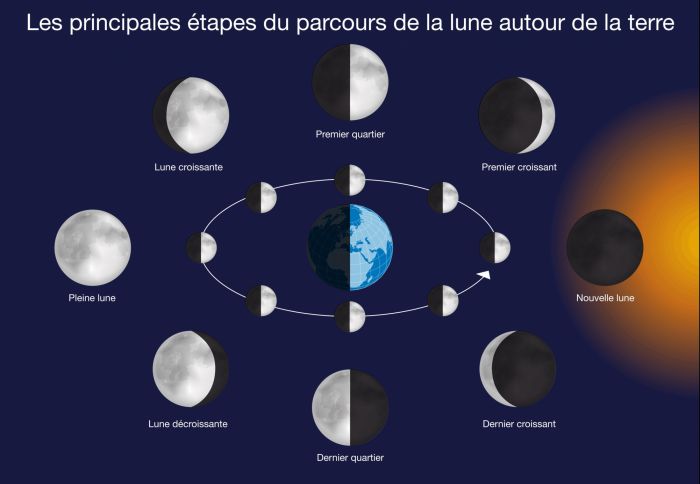 Le cycle lunaire dure 29 jours environ, il y a plusieurs phases :