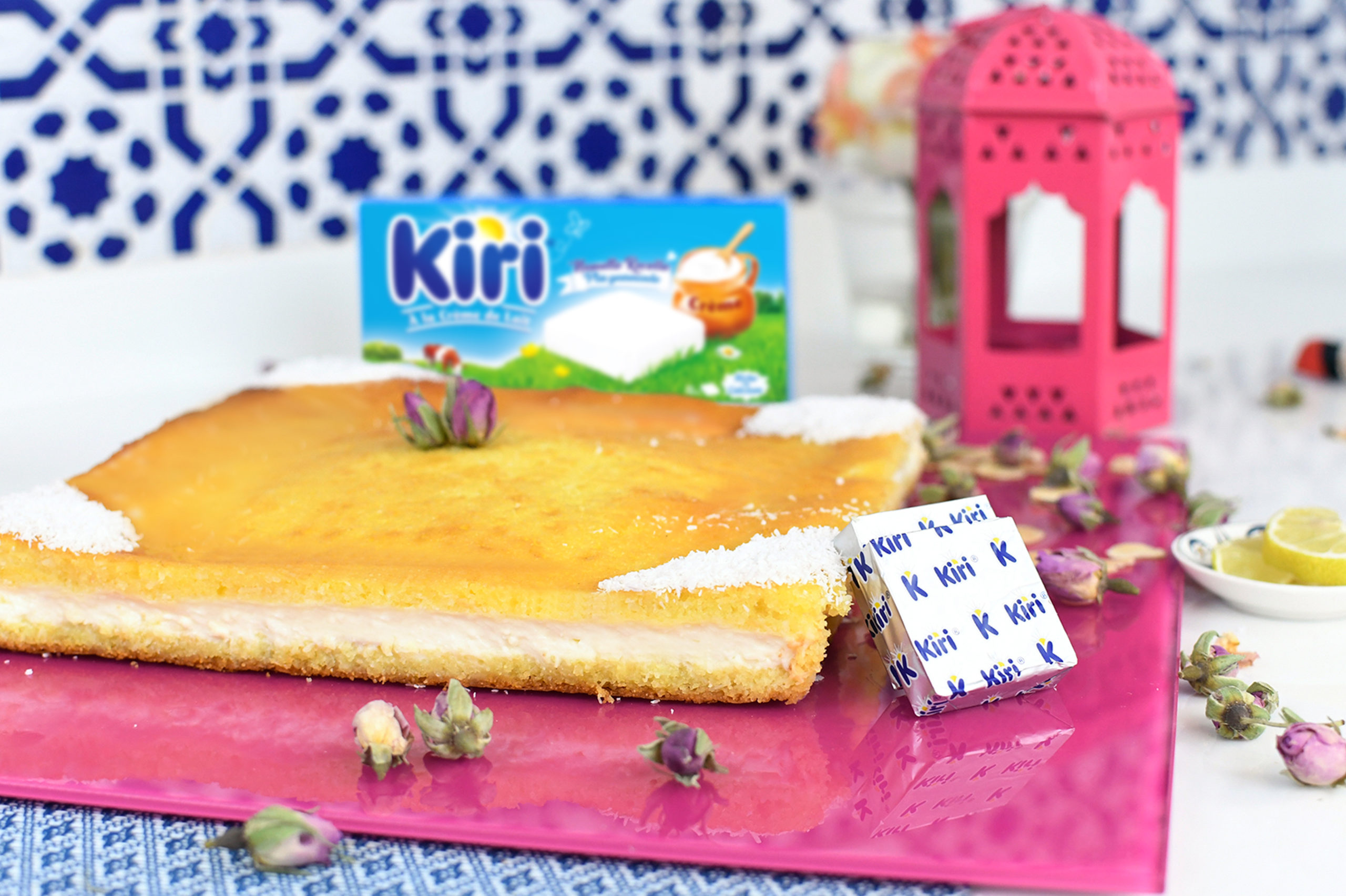 Au moment de servir, décorez la basboussa à la crème de Kiri® de quelques roses et de noix de coco râpé. Présentez.