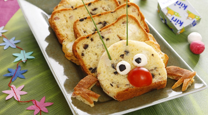 Pour réaliser le mille-pattes , disposez les tranches du cake en quinconce pour réaliser le corps. Pour faire la tête, placez une tranche arrondie, disposez dessus une demie tomate cerise pour la bouche et des bouts d'olive noire pour faire les yeux !
