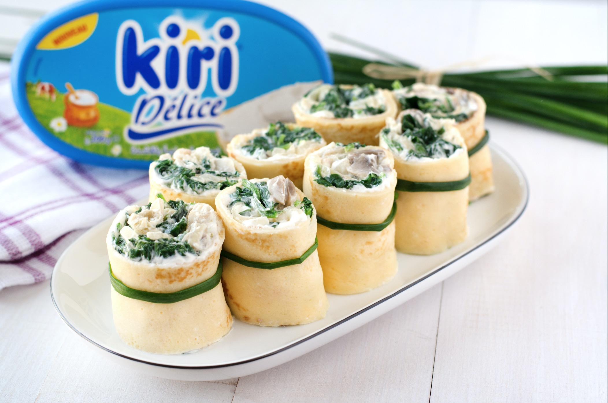 Roulez les crêpes bien serrées sur la garniture, et coupez-les en bouchées de 3 cm de longueur.