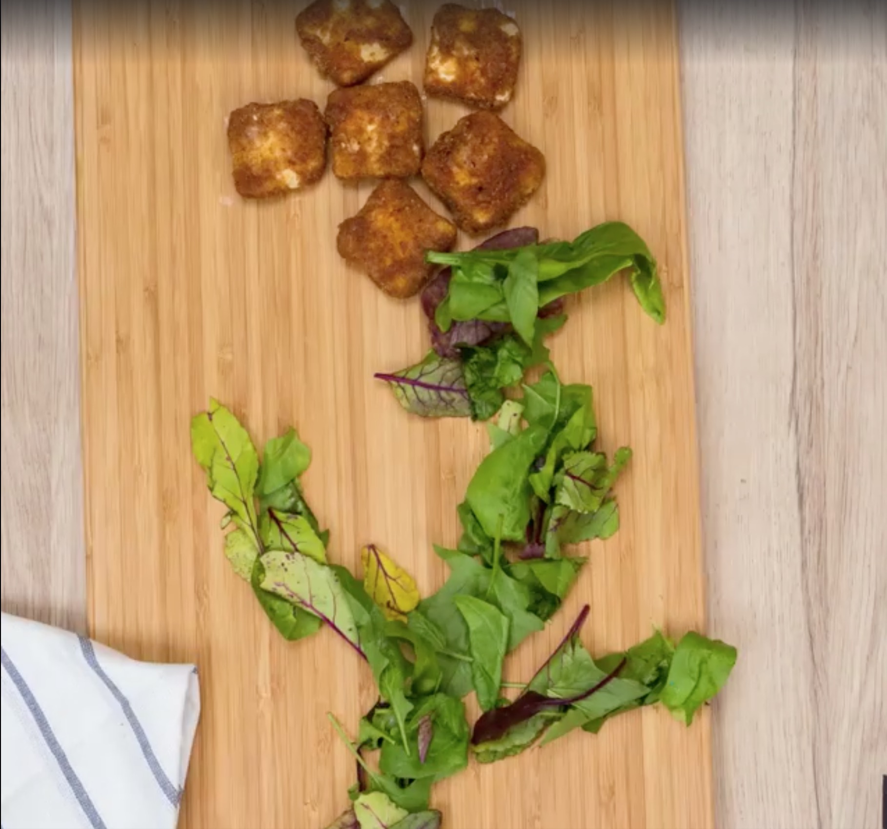 Dresser le fromage pané dans une assiette sur des feuilles de salade verte ou de roquettes.
