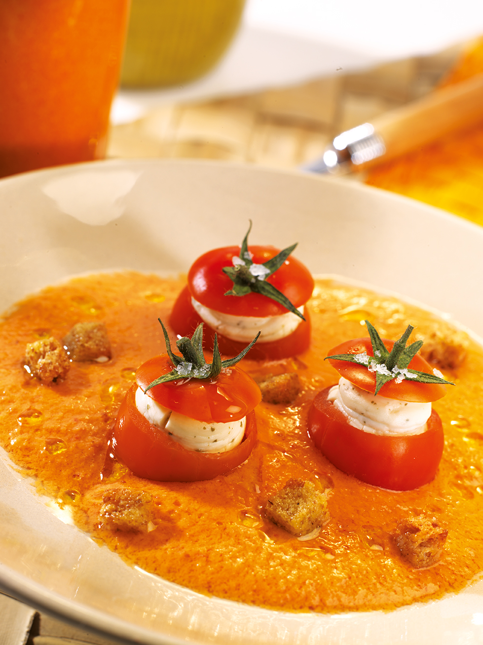 Verser le gaspacho dans une assiette creuse, disposer les tomates farcies et parsemer de croûtons.