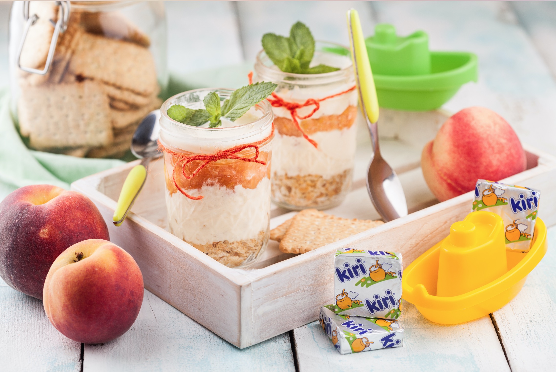 Dans des verrines, placez un peu de mousse pêche, déposez dessus une couche de confit de pêche, puis répétez les couches mousse suivie de confit de pêche. Ajoutez finalement une fine couche de mousse Kiri-pêche.