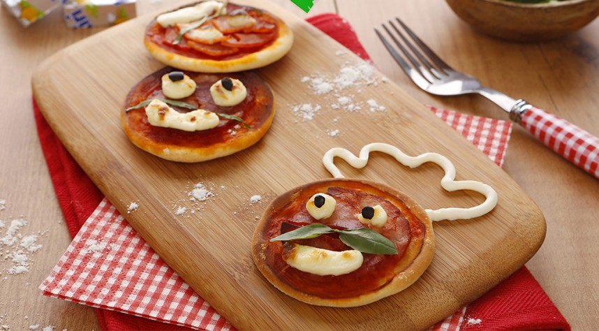 Réalisez le visage du pizzaïolo avec du fromage Kiri® écrasé et disposez deux feuilles de basilic pour réaliser les moustaches. Réalisez la toque à l'aide d'une poche à pâtisserie remplie de fromage Kiri® !