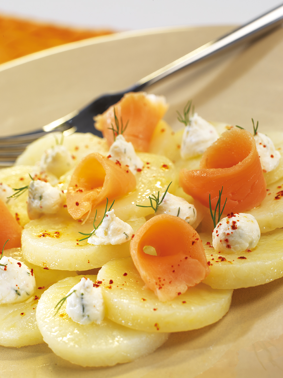 Disposer les pommes de terre dans une assiette et ajouter les tranches de truite fumée.